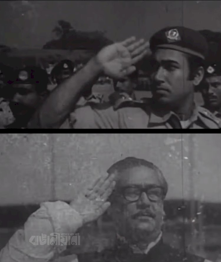 বিভিন্ন অ্যাঙ্গেল থেকে নেওয়া হচ্ছে শট। একসময় অধৈর্য হয়ে পরিচালক চাষীকে স্নেহের ধমক দেন বঙ্গবন্ধু, ‘এই, কতক্ষণ হাত তুইলা রাখব রে।’ চাষী নজরুল কাঁচুমাচু মুখে বললেন, ‘আর অল্প কিছুক্ষণ।’ বঙ্গবন্ধু বললেন, ‘আরে কী করস না করস তোরা।’ কিন্তু ঠিকই শুটিং শেষ করেন প্রায় মিনিট দশেক স্যালুট নেওয়ার ভঙ্গিমায় দাঁড়িয়ে থেকে।’’